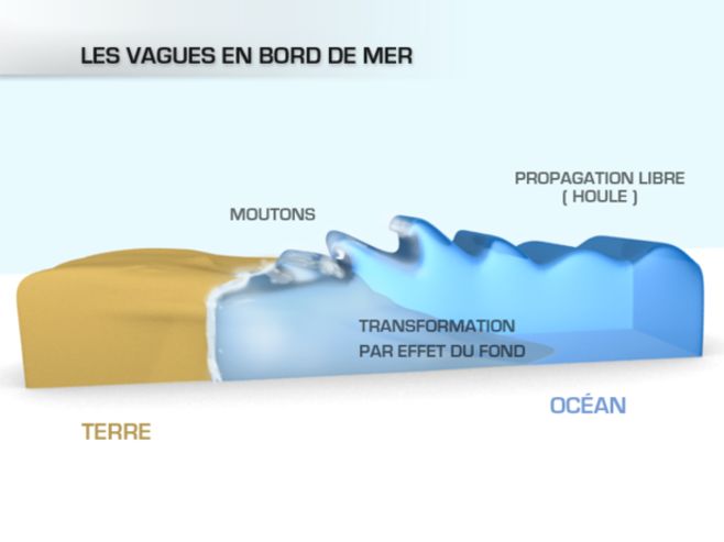 Par la suite, plus la houle s’approche des côtes, plus sa courbure s’accentue. Cette transformation est due à la diminution de la profondeur qui a pour conséquence de faire basculer l’eau de surface en avant en avant, une sorte de croche-pied.