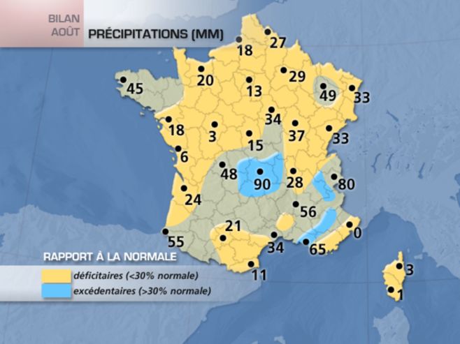 Le mois d’août 2009 a été chaud et sec sur une grande partie du pays. On retiendra la vague de chaleur concernant la plupart de nos régions entre le 15 et 20 août et les précipitations très déficitaires, notamment des Charentes à l’ouest du Bassin parisien, ainsi que sur l’extrême sud-est du pays.