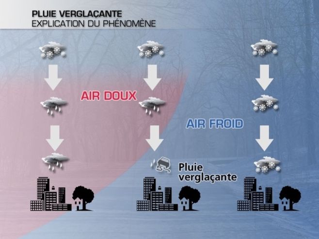 Mais la température au sol peut, malgré tout, être négative : la pluie se congèle alors en touchant le sol, et c’est ainsi que la pluie verglaçante apparaît.