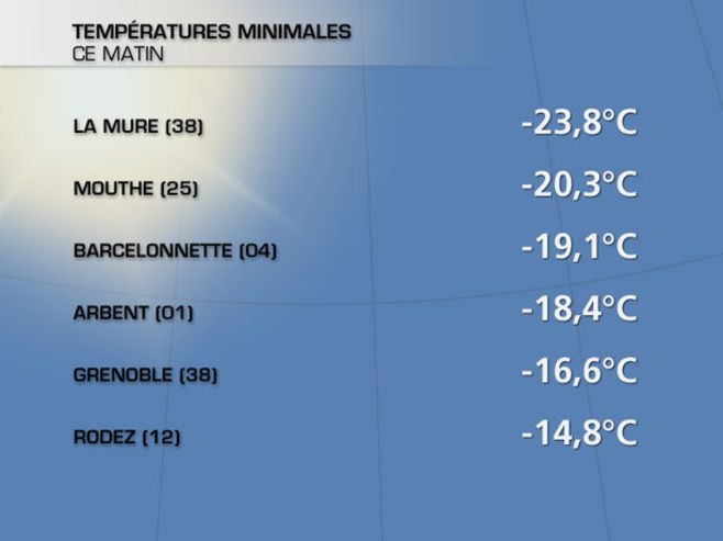 * -20,3°C à Mouthe (25), détentrice du record de froid national avec -36,7°C en 1968 (voire -41°C en 1985, valeur sujette à caution)