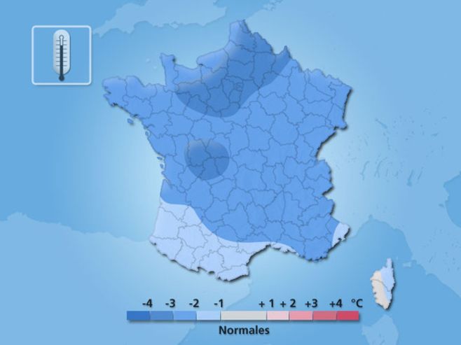1. Les températures Avec une température moyenne qui présente un déficit de 2,2° par rapport à la normale, il faut remonter à 1997 pour avoir un mois de janvier aussi froid sur les régions du nord et à 1992 sur la moitié sud du pays. Les températures baissent dès le début du mois de janvier avec une vague de froid qui s’installe du 4 au 12 avec des températures particulièrement basses observées dans les régions enneigées. Le 8 janvier, un record de froid est même battu à Brétigny-sur-Orge dans l’Essonne avec –20,6°. On relève aussi –16,2° à Dourdan (91), -17,5° à Melun (77), -18,1° à Blandainville (28) et -18,8° à Nangis (77). Le 11 janvier, c’est dans l’est que les températures plongent avec –13° à Luxeuil et jusque –17° à Grenoble. Les températures deviennent plus clémentes à la mi-janvier même si ce qui caractérise ce mois de janvier est l’absence de périodes de grande douceur. C’est sur la pays basque que la douceur est la plus marquée avec 18° enregistré le 19 à Biarritz mais on reste loin des 23,4° enregistré le 5 janvier 1999. Au cours de la dernière décade, les températures baissent à nouveau avec de fortes gelées observées le 27 janvier dans le nord-est : –9° à Metz (57), -10° à Givet (08) et jusque –12° à Volmunster (57). Au total, les régions situées entre le Bassin parisien et la Belgique et le centre-ouest sont les régions présentant le déficit thermique le plus important, de l’ordre de 3°. Sur les autres régions le déficit est généralement proche des 2°. A noter tout de même des valeurs proches de la normale sur la Corse qui est restée à l’écart de la vague de froid de début janvier. On d’ailleurs relevé aucun jour de gelée à Bastia et Ajaccio !