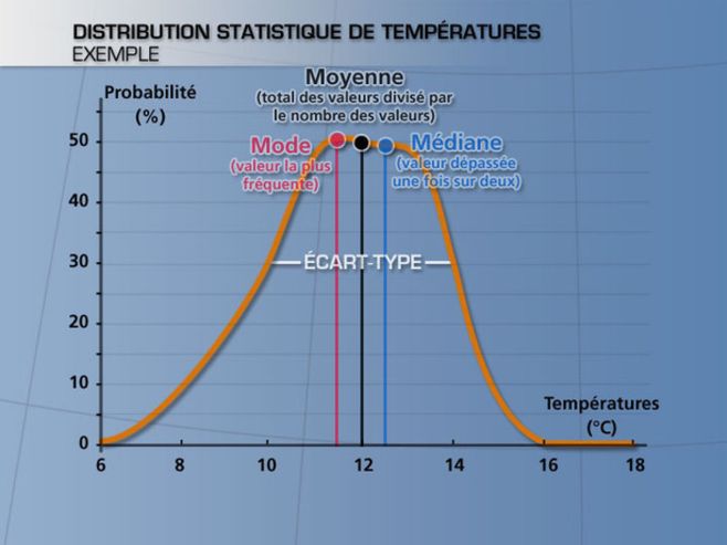 « Vous avez raison sur la définition que vous donnez de la moyenne qui englobe effectivement des valeurs qui peuvent être très contrastées. D'un point de vue statistique, l'habitude (pour ne pas dire la norme) en météorologie, est de travailler sur un échantillon de 30 ans. Nous avons le choix de communiquer, pour les 30 valeurs mensuelles, puis pour les 30 valeurs annuelles le calcul de :