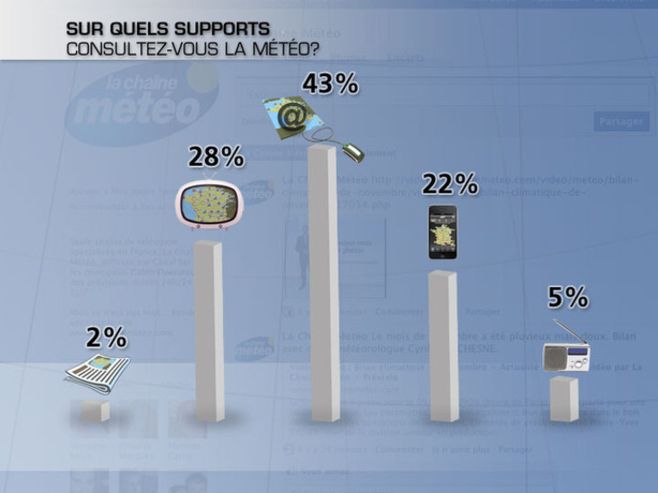 La télévision arrive en deuxième place puisque vous êtes 28% à consulter les prévisions météo sur notre chaîne, sur le satellite ou le câble.