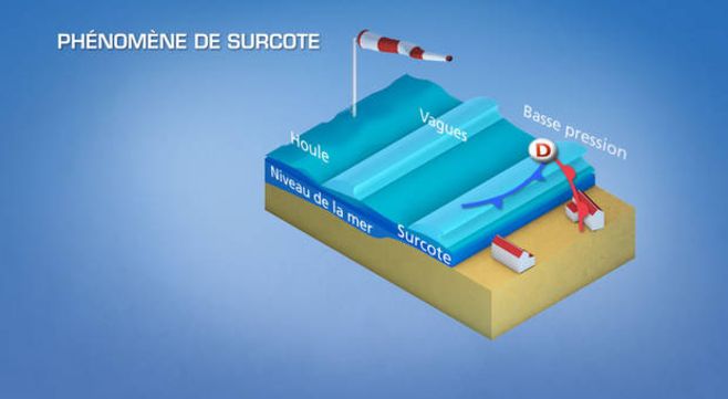 Rappelons tout d’abord que le phénomène de surcote consiste en une variation locale et temporaire du niveau de la mer provoquée par les variations du vent et de la pression atmosphérique.