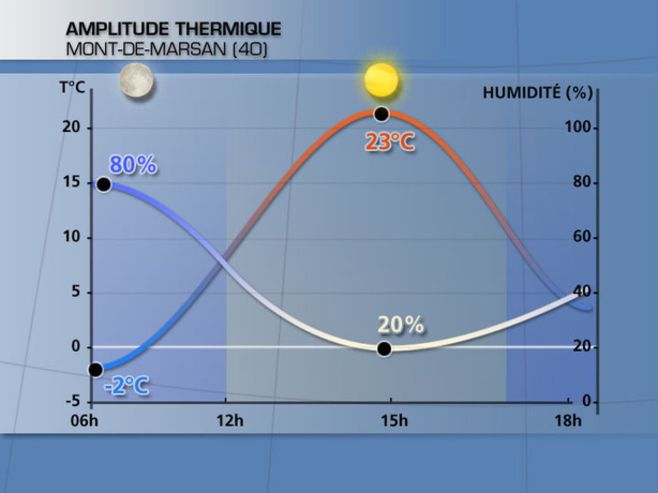 Cela est d'autant plus valable que nous sommes en présence d'une masse d'air très séche. Nous avons pris l'exemple de Mont-de-Marsan (Landes), où la température nocturne s'était abaissée à -2°C (il avait fait -5,5° la nuit précédente), pour remonter à 15° à 10H00 puis 23° au maximum de l'après-midi.