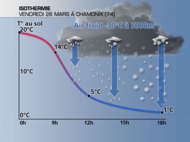Avec l'arrivée de la perturbation dans l'est, un net refroidissement s'est produit en altitude avec le retour de la neige dès 700 à 800 m sur le Jura et les Alpes. Dans le Jura, après des températures proches de 20° hier, c'est donc le retour de l'hiver ce vendredi avec quelques centimètres au sol dès 800 à 900 m d'altitude. Cette neige touche également le nord des Alpes où par isothermie (lorsque l'air froid d'altitude descend vers les basses couches de l'atmosphère), des flocons peuvent être observés temporairement vers 400 à 500 m !