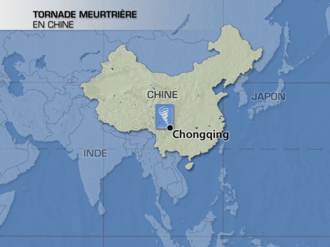 Une dégradation orageuse très marquée a circulé sur la Chine hier matin, accompagnée de très importantes précipitations, mais aussi localement de tornades. La région de Chongqing a été la plus touchée, et l'on déplore près de 40 victimes. La plupart l'ont été sous une puissante tornade qui a concerné des régions rurales.