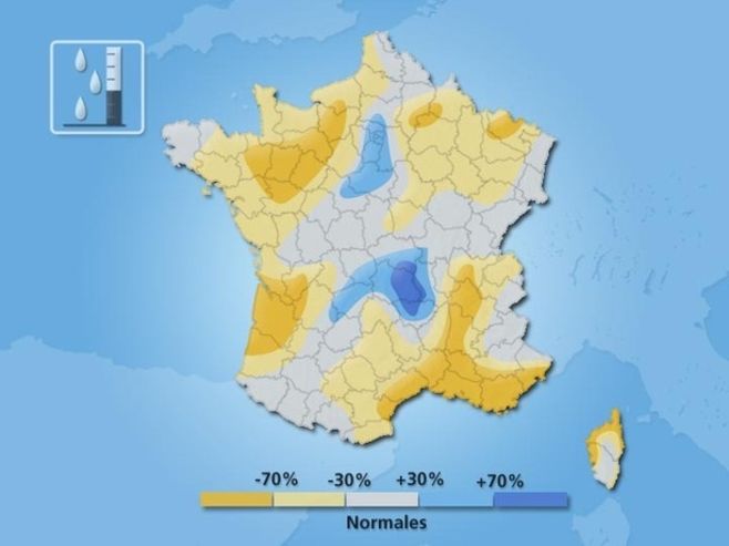 2. Les précipitations. Les précipitations de ce mois de juillet 2010 sont déficitaires sur une bonne partie du pays. La sécheresse s’installe d’ailleurs sur certaines régions comme la Normandie, les Pays-de-la-Loire ou la Bretagne car le printemps a été peu arrosé. Au cours de ce mois de juillet, le déficit dépasse les 70% de l’Anjou et du Bassin rennais à la Normandie, sur la Gironde et les régions du sud-est. A Toulon, il n’est pas tombé la moindre goutte d’eau au cours de ce mois de juillet ; bien peu d’eau aussi sur Alençon et Cazaux avec respectivement 4 et 7 millimètres. Quelques régions sont tout de même concernées par de fortes précipitations orageuses mais ces orages sont souvent localisés. C’est en Auvergne qu’on observe les cumuls de pluie les plus importants avec 92 mm à Clermont-Ferrand, 97 mm à Saint-Etienne, 106 mm au Puy-en-Velay et jusque 120 mm à Vichy. Paris subit aussi de violents orages avec un cumul de pluie mensuel de 96 mm. En début de mois, des orages localisés mais parfois violents se produisent les 2 et 3 juillet. On relève 45 mm à Besançon, 51 mm à Saint-Chamond (42), 57 mm à Ussel (19), 50 mm à Gourdon (46), 59 mm à Venisey (70) et jusque 69 mm à Brive (19). En deuxième décade, le temps tourne à nouveau à l’orage le 12 juillet avec 33 mm à Paris, 42 mm à Epenoy (25), 47 mm à Blesmes (02) et 52 mm à Trois-Epis (68). De violentes rafales de vent balayent la Champagne-Ardennes avec 111 km/h observé à Douzy (08) et jusque 121 km/h dans la région de Chalons-en-Champagne (51). Le 14 juillet, de fortes pluies orageuses concernent le Bassin parisien. A Paris on relève 43 mm dont 27 mm en une heure, intensité rarement atteinte en région parisienne. De violentes rafales de vent se produisent à nouveau sur la Champagne-Ardennes jusque dans l’Avesnois : 126 km/h à Chouilly (51) et jusque 146 km/h à Saint-Hilaire-sur-Helpe (59). En dernière décade, quelques orages concernent l’est du pays et la Corse mais ils ne donnent pas de cumuls de pluie remarquables.