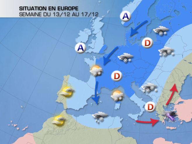 Plusieurs perturbations traverseront le pays, du nord vers le sud, atteignant cette fois-ci les régions méridionales. Mardi et mercredi, elles engendreront des chutes de neige faibles à modérées en progressant de la Belgique vers le sud-ouest du pays. Des épaisseurs de 2 à 5 cm, localement 10 cm sont estimées à ce jour. En même temps, des averses de neige se déclencheront dans le sud-est probablement jusqu'au littoral sur la Corse et la Côte d'Azur, avec un refroidissement très brutal. Entre jeudi et vendredi, ces perturbations seront plus actives : elles descendront des iles britanniques vers le sud de la France. Dans ce contexte, le risque de fortes chutes de neige deviendra plus élevé avec des cumuls qui pourront atteindre 10 à 15 cm en quelques heures en plaine. Les côtes de la Manche seront une nouvelle fois exposées à des accumulations neigeuses conséquentes. La répétition de ces chutes de neige engendrera la formation d’une épaisseur qui pourrait atteindre 20 à 30 cm par endroits dans le sillage des perturbations, mais là encore, le manteau neigeux sera très inégal : certains secteurs y échapperont, alors que d'autres connaîtront une situation comparable à ce début décembre.