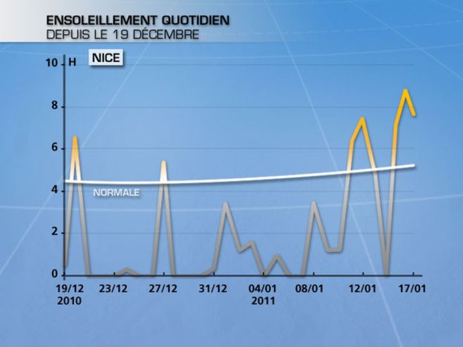 Près de 80 % de déficit d’ensoleillement pour la deuxième quinzaine de décembre et 40 % depuis le début de l’année, c’est ce que révèle l’analyse des relevés de la station météorologique de Nice. Habitués à profiter en moyenne de 5h de soleil par jour à cette période, les Niçois ont subi depuis le 19 décembre près d’1 jour sur 2 de totale grisaille et 5 jours d'un ciel très nuageux.