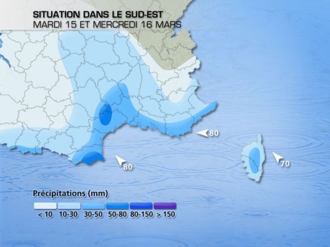 En France, après un court répit lundi, un nouvel épisode pluvio-orageux actif concernera un tiers sud à partir de mardi. Sa localisation reste à préciser, mais une nouvelle fois, le Languedoc-Roussillon pourrait être le plus affecté par pluies et vents forts. Peu de régions méridionales seront épargnées par les précipitations. Localement, on attend jusqu'à 200 mm depuis ce week-end.