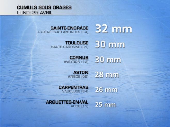 Les régions les plus exposées ont été la vallée de la Garonne, le Limousin, ainsi que la vallée du Rhône et le Languedoc. Les orages de grêle ont été très fréquents, parfois accompagnées de rafales de vent (près de 80 km/h à Bordeaux). Les cumuls pluviométriques ont parfois dépassé les 20 mm par heure, avec par exemple :