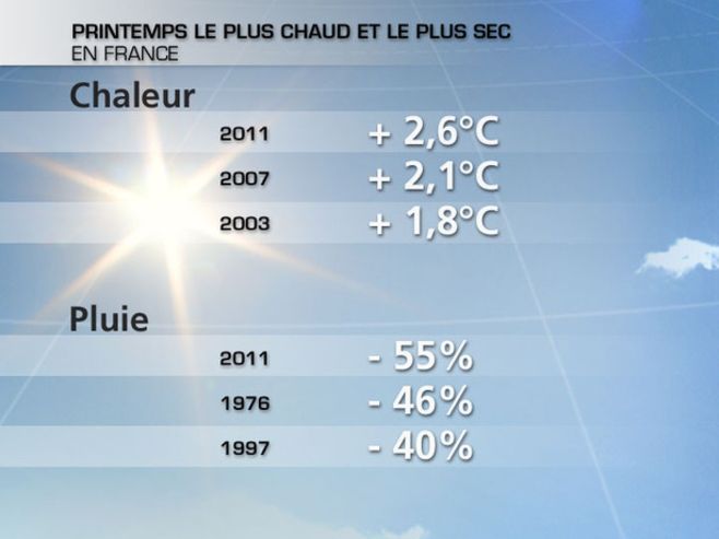 Ainsi, ce printemps 2011 vient au premier rang des printemps les plus secs, devant 1976 (déficit de 46%) et 1997 (déficit de 40%).