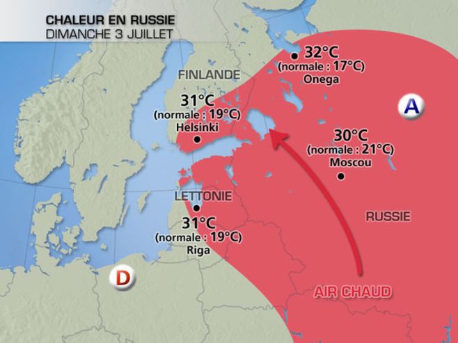 Dimanche, la chaleur était particulièrement marquée de l'Ukraine au nord-ouest de la Russie à la Finlande juqu'aux pays baltes. La barre des 30°C a été fréquemment atteinte dimanche. Cette chaleur s'explique par un anticyclone présent sur le centre de la Russie et qui a fait remonter dans un flux de sud de l'air chaud jusqu'à des latitudes très septentrionales.