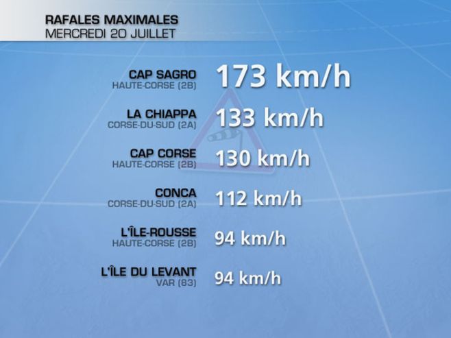 Les rafales maximales ont atteint 173 km/h au sémaphore du cap Sagro, à environ 20 km au nord de Bastia (côte Est), mais aussi entre 110 et 130 km/h dans les parages de porto-Vecchio ou encore de Solenzara. En montagne, ces rafales approchaient fréquemment les 80 à 100 km/h.