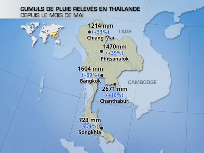 La Thaïlande se trouve actuellement dans sa période de mousson qui débute au mois de mai pour se terminer en octobre. Durant cette période, il tombe habituellement près de 1280 mm de pluie soit 88 % de la pluviométrie annuelle. Cette année, ce ne sont pas moins de 1604 mm qui sont tombés à Bangkok entre mai et septembre, soit 110% de la pluviométrie annuelle normale.