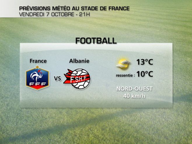 Pour ce match face aux albanais, nation modeste du football, dont la star est l'ancien joueur de Marseille Lorik Cana, les conditions météo ne seront pas forcément optimales. Le ciel s'annonce très partagé entre nuages et trouées, mais le risque d'averses sera limité. En revanche, le vent soufflera fort, jusqu'à 40 km/h de secteur nord-ouest. Il accentuera encore la sensation de fraîcheur car les températures ne dépasseront pas 13°C au coup d'envoi. A la fin du match, on attend simplement 11°C, pour un ressenti franchement froid.