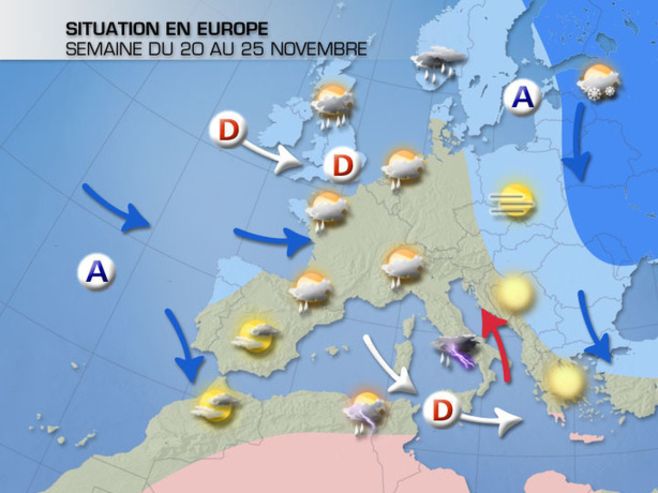 Entre lundi et mercredi, des perturbations d'activité généralement faible à modérée circuleront sur le pays. Elles seront plus marquées et plus durables dans l'ouest, tandis que seules quelques gouttes sont attendues de l'Alsace aux Alpes. La neige fera d'ailleurs son retour en montagne au dessus de 1800 à 2000 m. Le changement principal concernera les régions méditerranéennes, où après plusieurs semaines d'entrées maritimes, le mistral devrait faire son retour, ainsi que la tramontane.