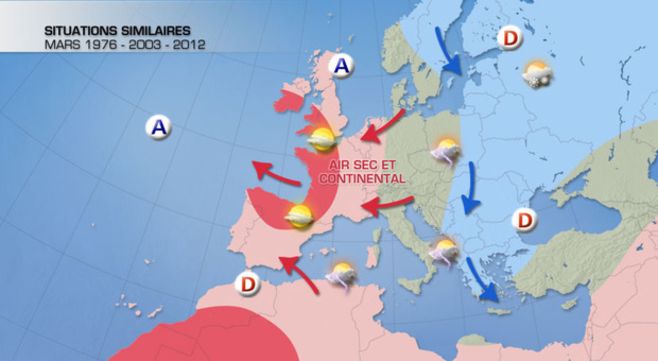 La question d'un risque de canicule pour cet été semble donc plus légitime cette année : le risque est plus fort en raison de la configuration climatique du mois de mars écoulé, qui présente d'étonnantes similitudes avec les mois de mars des années 1976 et surtout 2003 - année de la canicule. Que ce soit en terme de températures (supérieures de 2°C aux moyennes), de déficit hydrique et d'excédent d'ensoleillement, le mois de mars 2012 présente les mêmes caractéristiques qu'en 2003.