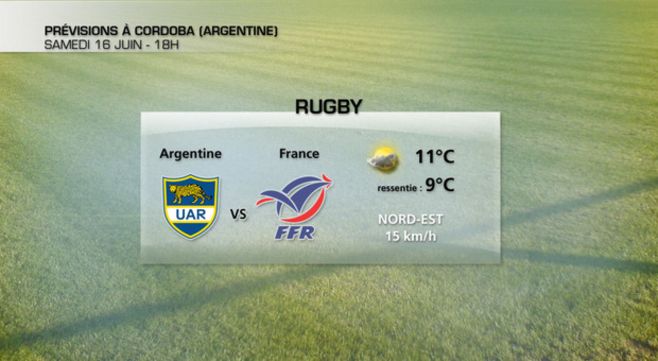 Pour ce match, les conditions seront mitigées à Cordoba, mais pas défavorables à la pratique du rugby. Si le ciel restera assez menaçant, aucun risque de pluie n'est à signaler. Le vent sera généralement faible à modéré de nord-est, tandis que les températures varieront de 11 à 9°C entre le début et la fin de la partie. Il s'agit de valeurs de saison.