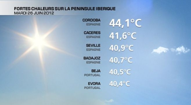De l'air particulièrement chaud venu du Maroc (47°C observé à Marrakech mardi après-midi) envahit la péninsule ibérique depuis quelques jours. Hier, les températures ont dépassé la barre des 40°C sur de nombreuses régions d'Espagne et plus localement sur le Portugal.