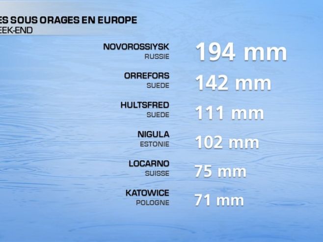 La Russie n'a pas été le seul pays exposé à des intempéries ce week-end. Sur les îles britanniques, les pluies ont été très soutenues samedi (jusqu'à 60 mm), mais cela n'a pas causé d'inondations majeures. En revanche, c'est sur le sud de la Suède que de très violents orages se sont produits samedi soir. Ils ont concerné la région de Jonköping.