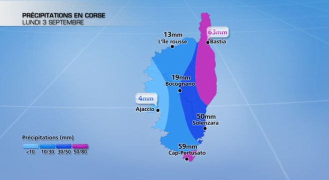 A Bastia par exemple, il est tombé 63 mm depuis dimanche, alors qu'entre juin et août, les pluviomètres n'avaient même pas recueilli une dizaine de millimètres. Là aussi, rien d'exceptionnel car l'été est traditionnellement chaud et sec en Corse. Les autres villes les plus arrosées hier ont été Solenzara (50 mm) et le Cap Pertusato (59 mm, dont 20 en une heure cette nuit sous orage violent). Aujourd'hui, des cumuls similaires sont attendus sur la façade orientale.