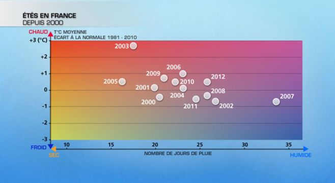 Ces deux dernières années (2011 et 2012), les mois de juillet ont certes été très maussades (20 jours de pluie dans le nord-ouest, près de 100 mm à Paris en juillet 2012), mais juin et août se sont ratrappés avec un temps souvent sec (excepté en Rhône-Alpes et Franche-Comté où de nombreux orages ont éclaté).