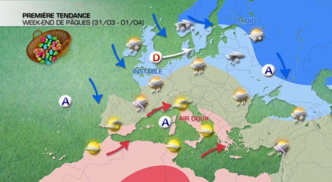 Cette année, il n'y aura pas de changement aussi radical du temps car l'on devrait conserver ces conditions de froid et d'instabilité qui caractériseront, au final, l'ensemble de ce mois de mars 2013. Comme nos prévisions saisonnières le mentionnaient, l'hiver risque de jouer les prolongations tardivement jusqu'en avril : ainsi, le week-end de Pâques risque d'être plutôt froid, sous l'influence des vents du nord.