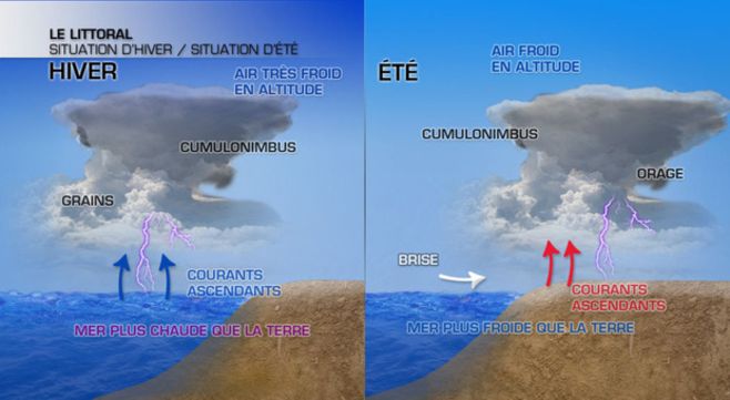 Halte aux idées reçues, les orages n’éclatent pas seulement à l’issue d’une journée chaude et lourde même si cela constitue un indice probant ! Plusieurs configurations météo peuvent conduire au déclenchement d’un orage. En été, le passage d’un front froid venant de l’Atlantique pourra être générateur d’orages dans le golfe de Gascogne. Mais parfois, on pourra constater qu'un vent d’ouest se lève brutalement sur la côte Aquitaine (« la Galerne »), apportant un net rafraîchissement et l’arrivée d'un brouillard alors que l’orage éclate dans l’intérieur des terres ! En Méditerranée, les orages de chaleur bourgeonnent surtout sur les reliefs de l’arrière-pays (on peut voir alors particulièrement bien le développement vertical des Cumulo-Nimbus, faisant du sur-place sur la montagne alors que le ciel reste bleu sur la mer).