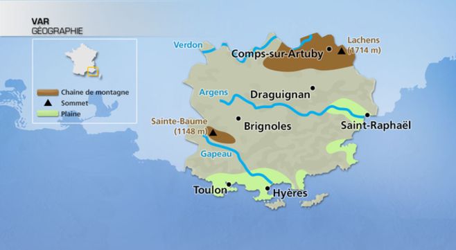 Dans l'arrière-pays, on trouve un paysage de plateaux et collines avec quelques reliefs un peu plus marqués (la Sainte-Baume à l'ouest du département culminant à plus de 1000 m d'altitude, les Maures (771 m) et l'Esterel (618 m) vers l'est du département.