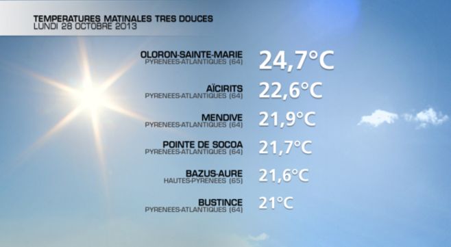 Après un week-end très doux en montagne et chaud en plaine (jusqu'à 28°C vendredi), la situation va franchement changer. Ce matin, on relevait encore des minimales remarquables, jusqu'à 25°C à Oloron-Sainte-Marie, et plus généralement 20 à 22°C sur le piémont (voir notre tableau). Il s'agit de températures largement supérieures aux... minimales habituelles d'une fin octobre.