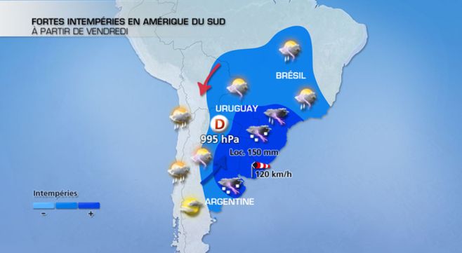 Les premières régions touchées seront dès jeudi soir la province de Cordoba, et la région de La Plata. Vendredi, les plus fortes cellules orageuses affecteront l'Uruguay, Buenos Aires, mais également le nord-est argentin et le sud du Brésil, jusqu'à la région d'Iguazu. Dans le courant du week-end, l'axe orageux le plus marqué glissera en direction du Paraguay et jusqu'en limite de Sao Paulo.