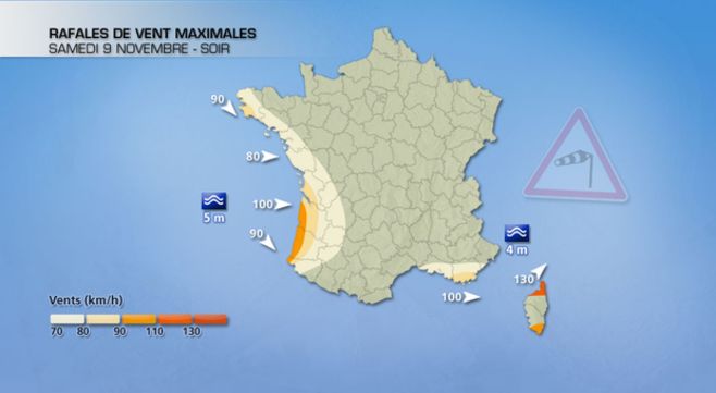 Une dépression s'est creusée rapidement sur la Bretagne et traverse tout l'ouest du pays ; à son passage elle provoque un fort coup de vent, qui n'a pas de conséquence sur les littoraux en raison de coefficients de marée relativement faibles (contrairement au week-end dernier).