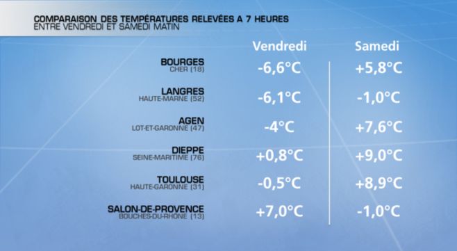 Ainsi, par endroit, on gagne plus de 10°C entre hier matin et ce samedi matin. Ainsi, à Bourges, on est passé de -5,8°C à +6,6°C. Même écart de température (+13°C) à Agen.