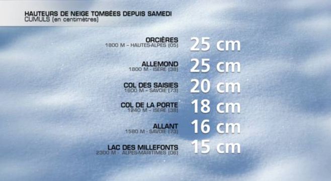 Ces deux vagues d'intempéries ont donné lieu à de nouvelles chutes de neige. Dans les Alpes, il a neigé abondament au-dessus de 2000 mètres avec des cumuls de 30 cm de neige fraîche vers 2300 mètres dans le massif des Ecrins, la Vanoise, le Queyras ou bien encore le Mercantour. Neige qui a fait une irruption remarquée samedi soir dans le Massif-Central, dès 500 mètres d'altitude, du côté de Millau et de Mende notamment où elle a tenu temporairement au sol. Chute de neige également dans les Pyrénées, mais la perturbation est passée trop rapidement sur la chaîne pyrénéenne pour apporter une couche de neige significativement importante.