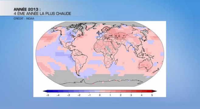 La NASA et la NOAA (organismes météorologiques et climatiques américains officiels) avaient rendu publics leurs bilans climatiques de l’année 2013 pour l’ensemble de la planète. Il en ressort que l’année 2013 fut l’une des 10 plus chaudes observées depuis le début des relevés météorologiques fiables (généralement admis depuis 1880, époque « pré industrielle »), sur la base de la moyenne 1981 – 2010. La moyenne de la température planétaire s’élève à 14,52°C. Selon ces organismes, 2013 serait la 4 ème ou la 7 ème année la plus chaude depuis 1880. Finalement, dans un rapport officiel publié fin mars, l'Organisation Météorologique Mondiale (OMM) a indiqué que 2013 serait la 6 ème année la plus chaude, ex aequo avec 2007.