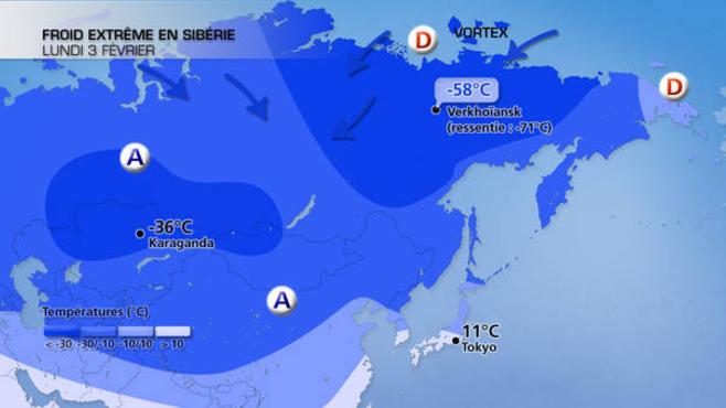 Ces températures glaciales résultent de la combinaison de deux acteurs : l’anticyclone de Sibérie, retranché sur la Sibérie Occidentale (avec des valeurs glaciales aussi au Kazakhstan par exemple), et le vortex polaire qui a tendance à dégouliner sur la Sibérie Orientale et même y prendre place. Ces deux ensembles favorisent l’accumulation du froid dans la région de Verkhoïansk, les plus froides de l’hémisphère nord. Les températures ne devraient pas rester à ce niveau très longtemps, avec un pic de froid attendu durant la nuit.