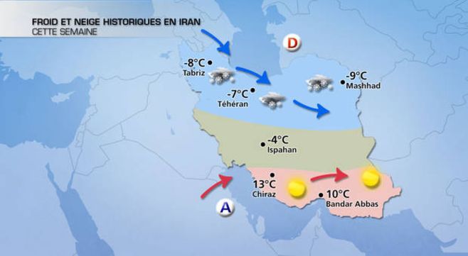 Ce sont principalement les régions du nord de l’Iran, proche de la mer Caspienne qui ont été les plus touchées par ces intempéries neigeuses jusqu’à la région de Téhéran, aux portes du Dasht-e Kavir, le principal désert iranien. Cette vague de froid, et ces chutes de neiges sont provoquées par la descente d’une masse d’air arctique et dépressionnaire jusqu’en Iran, sous l’influence des hautes-pressions situées actuellement entre Turquie et Finlande. Cette situation de blocage devrait perdurer encore quelques jours, si bien que la neige devrait retomber dans les mêmes régions d’ici quelques heures. Les températures sont d’ailleurs tombées à -10 °C dans le nord du pays, et -7°C à Téhéran, pour la première fois de l’hiver.