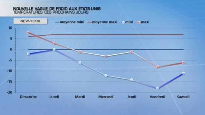 Après la tempête de neige, les températures vont à nouveau chuter et plonger sous les -10°C sur tout le nord des Etats-Unis en début de semaine. Entre mardi et vendredi, une nouvelle vague de froid très intense se met en place et on attend de nouveau plusieurs journées consécutives sans dégel entre New-York et la région des Grands Lacs. Sous l'influence d'une masse d'air arctique intense, les -30°C pourront être à nouveau atteints dans la région de Chicago notamment...