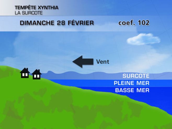 catastrophique était une « surcote » d’environ 1.50 m. Ce type d’inondations est-il prévisible ? » La réponse de l’expert de METEO CONSULT : « Il est difficile de prévoir l’ampleur des inondations parce qu’elles dépendent de nombreux facteurs et pas uniquement des conditions météo. Cependant, la surcote elle-même est un évènement qui se prévoit bien. Rappelons tout d’abord que le phénomène de surcote consiste en une variation locale et temporaire du niveau de la mer provoquée par les variations du vent et de la pression atmosphérique. Une baisse de pression de 1hPa se traduit par une élévation du niveau de la mer de 1cm. Une pression de 970hPa, 45hPa au-dessous de la normale 1015hPa, comme c’était le cas sur la Vendée au passage du centre de la dépression, justifie donc une hausse de 45cm. C’est en tout cas ce qui se passerait loin des côtes. Mais, près des côtes, les effets dynamiques liés à la forme du littoral et à la bathymétrie (profondeur d’eau) amplifient la surcote. Le vent soutenu de sud-ouest accumule l’eau au fond des estuaires et des embouchures. Il limite ainsi le déversement des fleuves. Dans ces conditions on sait que la surcote peut dépasser les 2m dans les Pertuis Charentais. Il faut ajouter que l’heure de la pleine mer coïncide avec le maximum de la tempête, et que la marée fait partie des plus grandes avec un coefficient de 102 sur une échelle allant de 40 à 120. Les prévisions des horaires de marées sont très fiables et disponibles au moins un an à l’avance. La prévision météo annonce les risques de la tempête une semaine à l’avance et confirme son intensité avec un délai de 24h. Les conditions étaient donc prévisibles, les conséquences non. » Retrouvez toutes nos prévisions météo par téléphone au 3201.