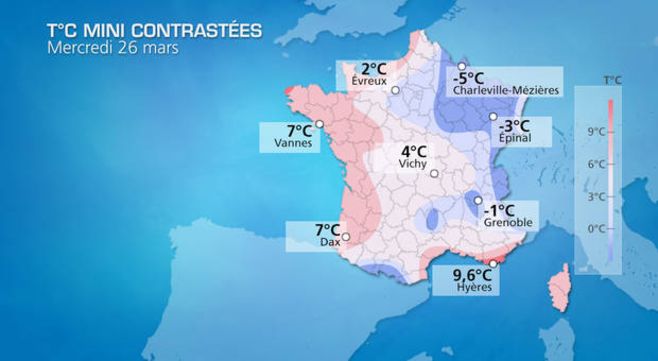On relève ce matin des températures froides sur le nord-est avec par exemple -4,2°C à Charleville-Mézières (08), alors que la douceur persiste sur l'ouest (9,2°C à Brignogan (29)) et en Méditerranée (8,9°C à Marignane (13)).
