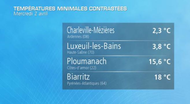 Les températures sont stables par rapport à la veille avec des minimales souvent comprises entre 5 et 15°C, du nord-est et du centre-est au Pays Basque. Les maximales sont également très élevées pour la saison, situées jusqu’à 8°C au-dessus des moyennes de saison. La barre des 20°C est atteinte quasiment partout, sauf près des rivages de la Méditerranée et de la Manche et jusqu’à 24°C dans le sud-ouest.