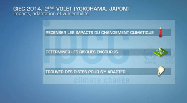 Le deuxième volet du GIEC 2014 a été rendu public à Yokohama (Japon) ce dimanche 28 mars dernier. Ce rapport vise à déterminer les impacts du changement climatique et la vulnérabilité des sociétés face aux aléas climatiques (montées des eaux, sécheresses, etc...) et à envisager des processus d'adaptation ("mitigation") : transition énergétique, agricole, etc...