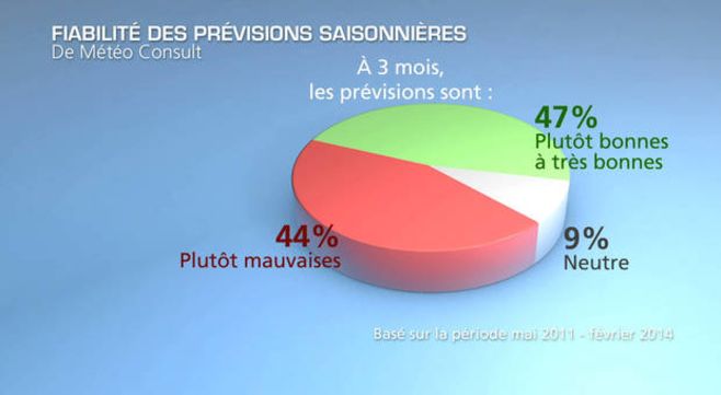 Afin d'être le plus transparent quant à nos résultats, nous avons réanalysé nos prévisions saisonnières effectuées entre mai 2011 et février 2014 (voir nos infographies). Il faut lire les graphiques de la façon suivante : " à trois mois, nos prévisions saisonnières étaient fiables à xx % ". On s'aperçoit que les résultats fluctuent en fonction de la saison prévue; en l'occurence, les prévisions réalisées pour les intersaisons sont meilleures que pour l'été et l'hiver (quoique ces résultats soient également fluctuants d'une année à l'autre).
