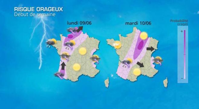 Ce matin, une première vague orageuse balaie les régions étirées du Poitou au Nord-Pas-de-Calais en passant par le bassin parisien. Ces orages s'estompent en milieu de matinée avec le retour d'un temps provisoirement plus calme. Mais ce soir, une nouvelle offensive orageuse remonte du Poitou en direction des côtes normandes. Ils se renforcent dans la nuit au nord de la Seine, entre la Normandie, l’Île-de-France, la Picardie et le Nord-Pas-de-Calais. Ils seront localement violents sur ces régions, avec un risque de grêle et de brutales rafales de vent. Après un répit lundi matin, l'instabilité reprend l'après-midi sur ces mêmes régions, avec de nouveaux orages de l'Aquitaine au Nord-est en passant par le bassin parisien. Ces orages se poursuivent en soirée et une partie de la nuit de lundi à mardi. Il faut à nouveau craindre des chutes de grêle et de brutales rafales de vent au passage des orages d'autant qu'il aura encore fait très chaud l'après-midi (31°C à Paris).