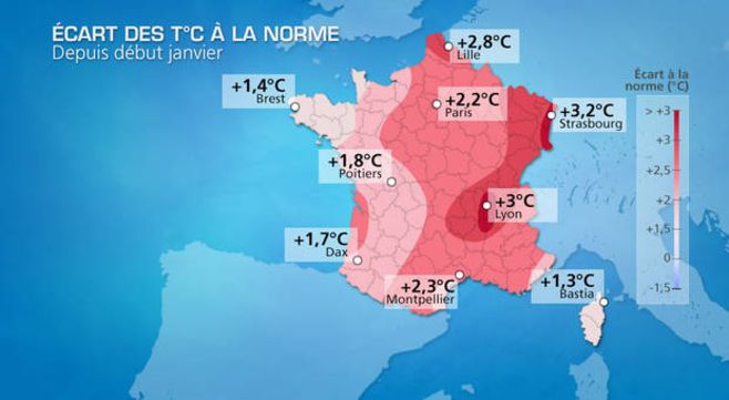 Contrairement aux températures, il existe un grand contraste entre les régions de l’ouest et les régions de l’est concernant l’écart à la norme des cumuls de pluie depuis début janvier. S’ils sont déficitaires dans l’est ainsi qu’en Languedoc et Roussillon (-50% à Nancy, -60% à Perpignan), ils sont largement excédentaires dans l’ouest (+40 % à Dax, +32% à Brest), mais aussi sur la côte d’Azur (+29% à Nice).