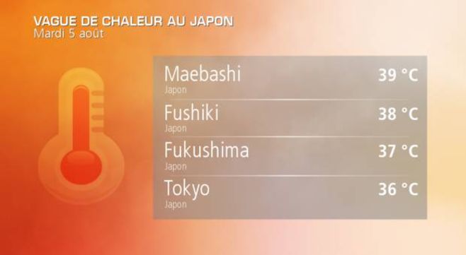 La température est montée jusqu’à 39,1°C à Tajimi dans le centre du Japon mais c’est quasiment tout le pays qui est concerné par de fortes chaleurs, aussi bien en journée (T°C maximales souvent supérieures à 35°C) que durant la nuit (T°C minimales rarement en dessous des 26°C). Seule l’île d’Hokkaido est épargnée par cette vague de chaleur. Ces valeurs sont supérieures en moyenne de 6 à 7 °C à celles de saison. A cette période de l'année, à Tokyo, la température devrait évoluer de 23 à 30°C.