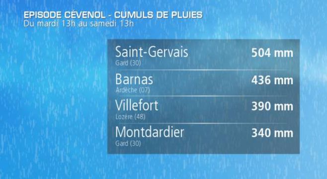 Après les violents orages vient l'heure du bilan. En termes de pluies, cet épisode cévenol a été remarquable sur sa durée, mais aussi sur son intensité. Par endroit, on a relevé entre 300 et 500m de précipitations entre mardi 13h et ce samedi 13h. Les Cévennes ont été frappées de plein fouet par ces pluies diluviennes, qui se sont produites par périodes.