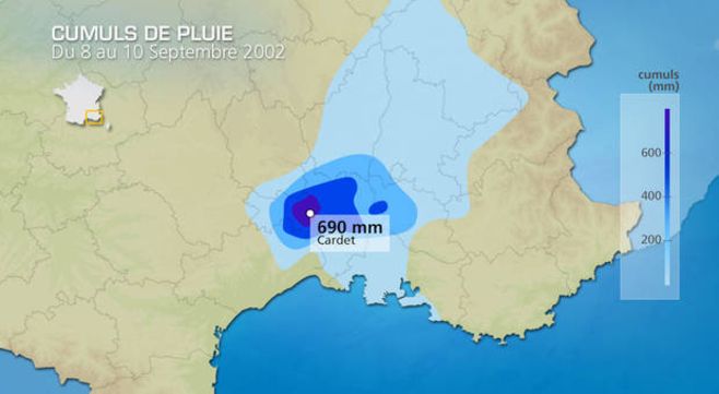 Un épisode cévenol particulièrement intense s'abat sur le Gard et une partie de l'Hérault. En 24 heures, il tombe jusqu'à 543 mm à Saint-Christol-les-Alès (30) et même 687 mm sur l'ensemble de l'épisode à Anduze (30) ce qui correspond à une année de précipitations à Paris. Les villes de Nîmes, Sommières, Alès et Aramon subissent de graves inondations. Dans l'Hérault, le secteur de Lunal subit lui aussi de graves dommages suite aux inondations. On compte 21 victimes et 1 disparu.